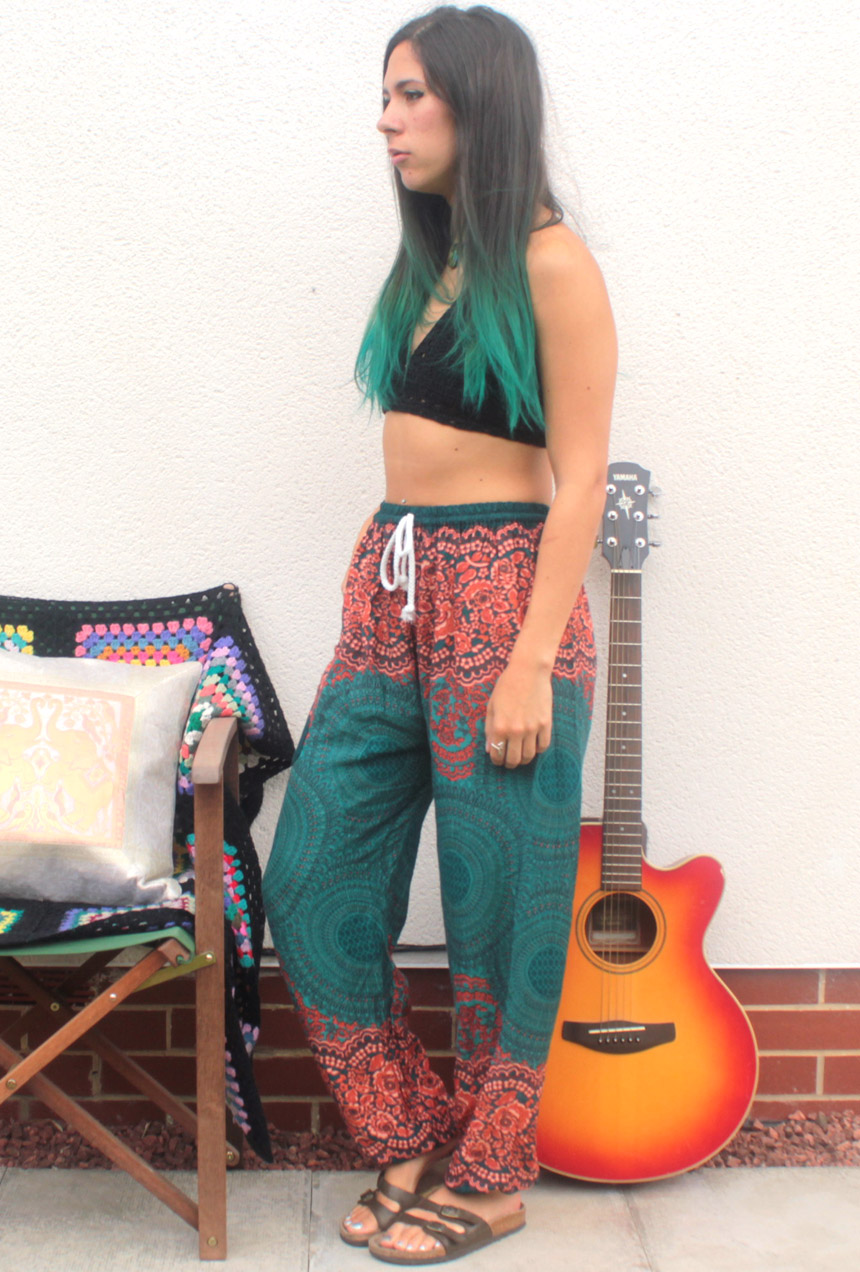 These Hippy Harem pants are perfect for yoga, lounging around and generally feeling amazingly comfortable. They fit a size 6-14 thanks to their super elasticated waist and ankles, so they will look awesome on you or make a great gift. I am giving away a slightly different pattern to my pair, but they are just as good as you can see below. Check out Sarah looking amazing in the print which you can win! She’s even throwing in a handmade necklace which she will create just for you: what a babe!