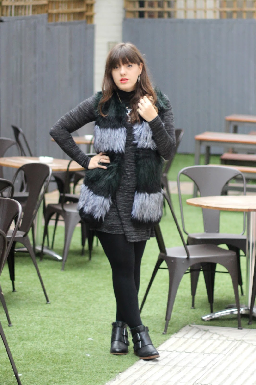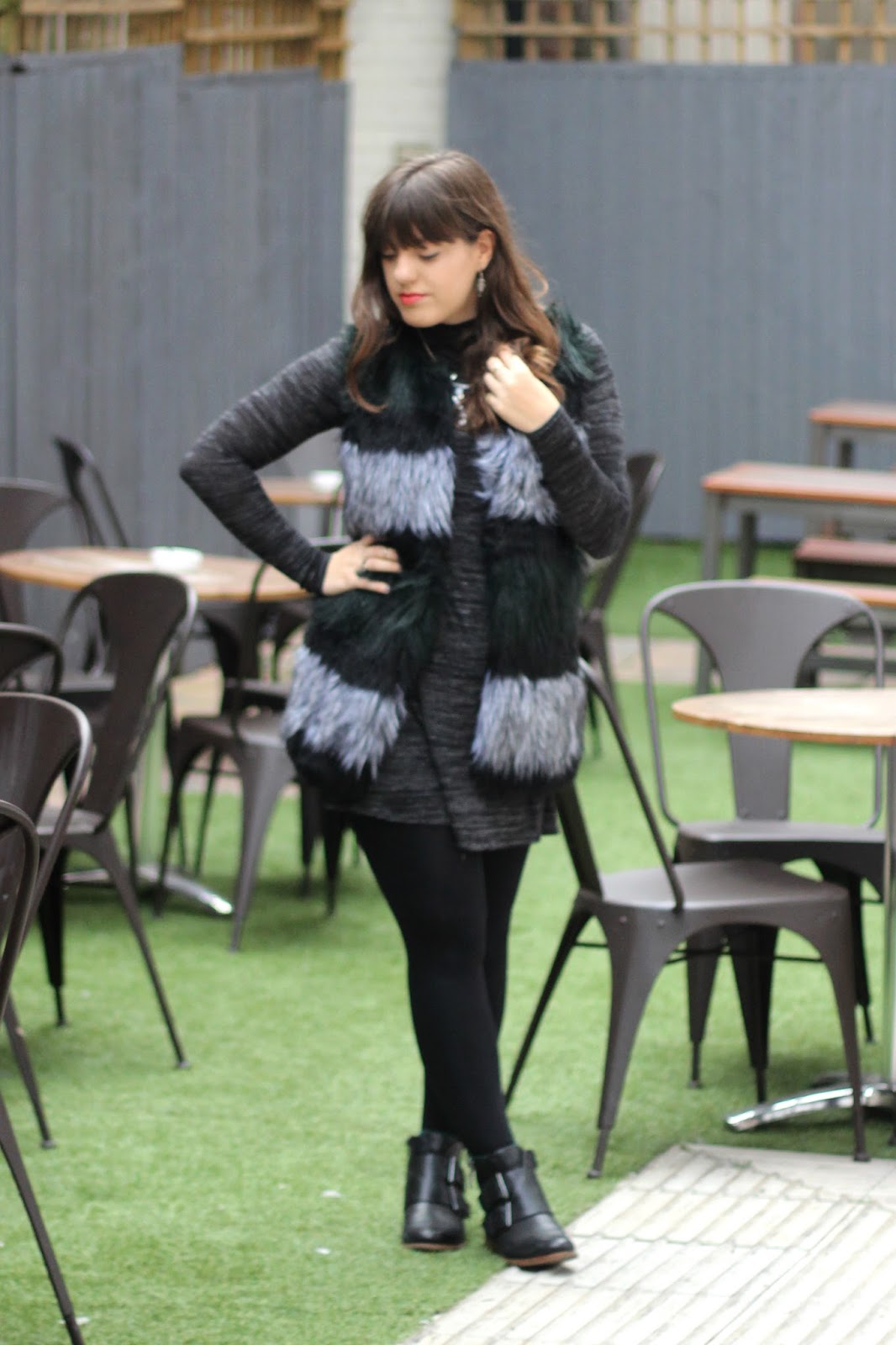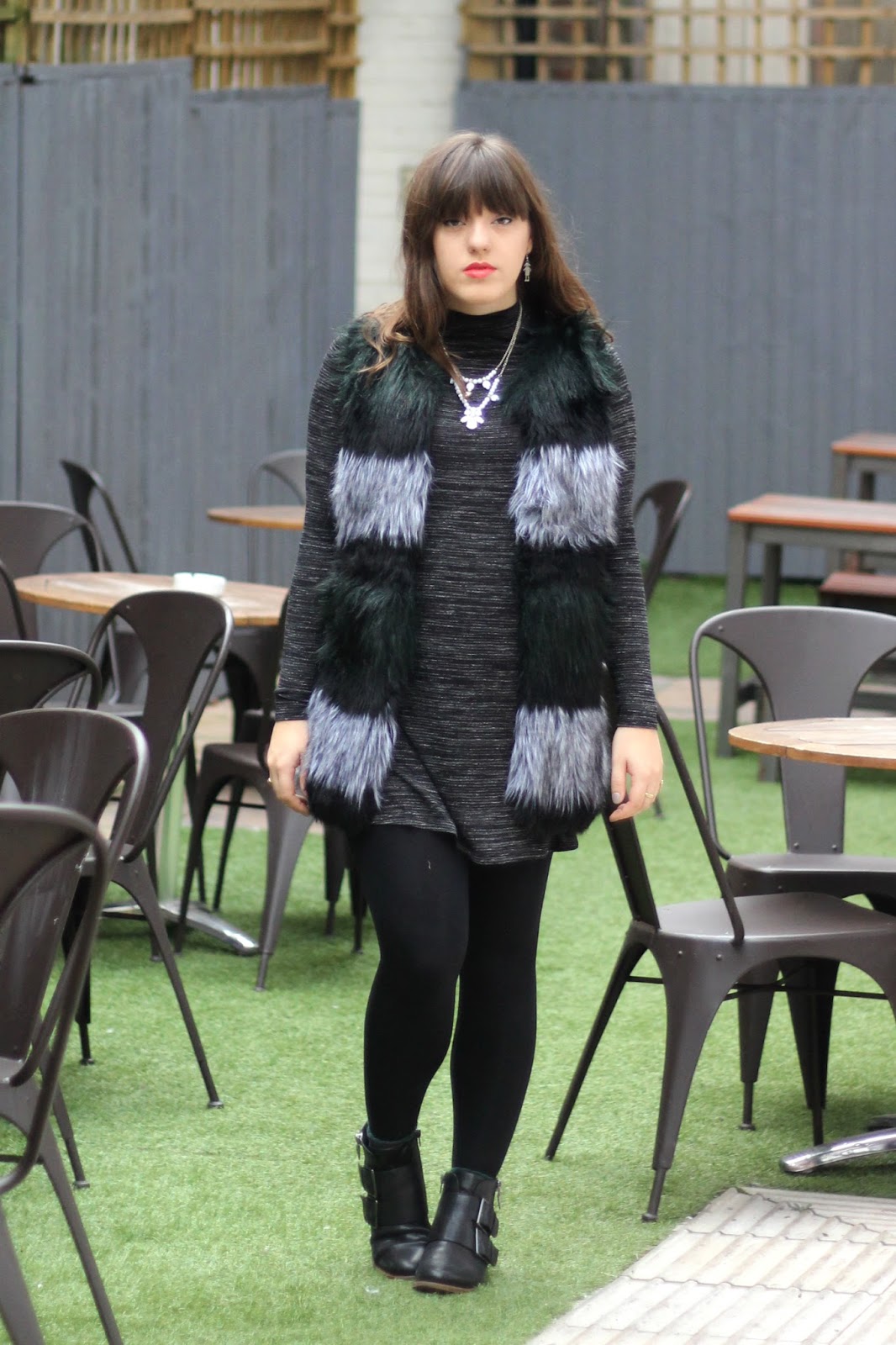 Dress: H&M. Faux fur gilet: H&M. Rings: Primark. Earrings: Platform 9 3/4, Kings Cross. Necklace: George at Asda* Boots: Clarks.