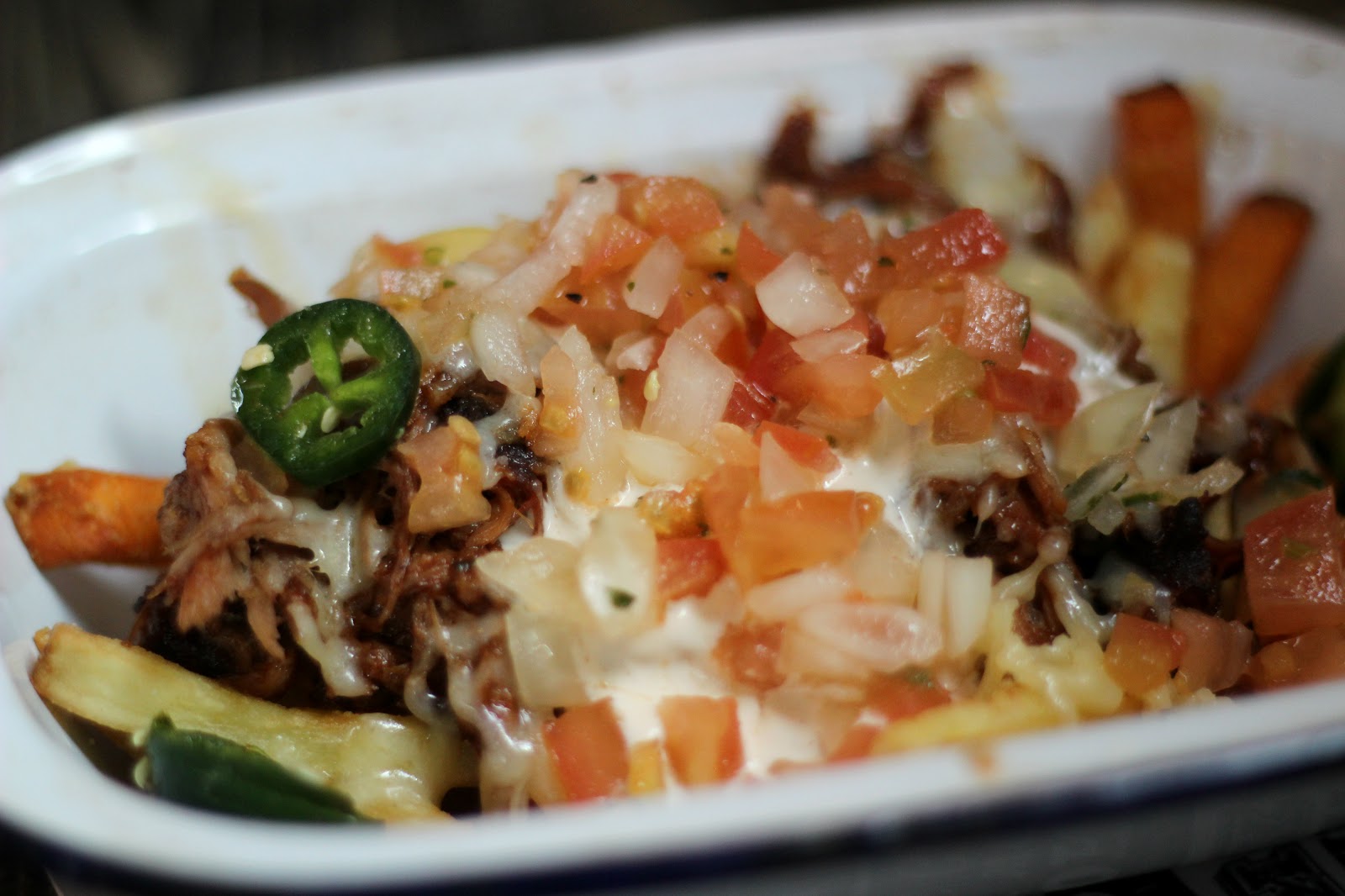 tender and the atmosphere is one of no-nonsense good food. To start, I chose the swine fries; I am obsessed with pulled pork and sweet potato fries, so I couldn’t resist choosing this loaded fries dish, covered in smoked pork, grilled cheese, jalapeños and salsa. It was huge but delicious and bursting full of heat and flavour; the perfect start to my epic meal.