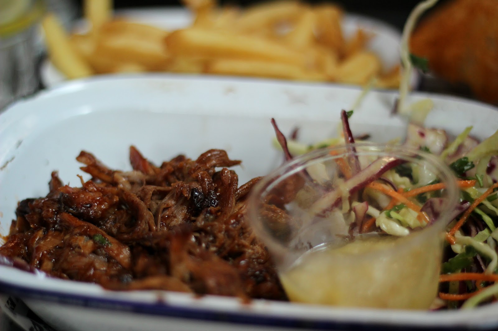 tender and the atmosphere is one of no-nonsense good food. To start, I chose the swine fries; I am obsessed with pulled pork and sweet potato fries, so I couldn’t resist choosing this loaded fries dish, covered in smoked pork, grilled cheese, jalapeños and salsa. It was huge but delicious and bursting full of heat and flavour; the perfect start to my epic meal.