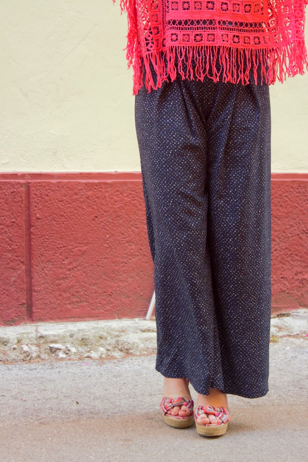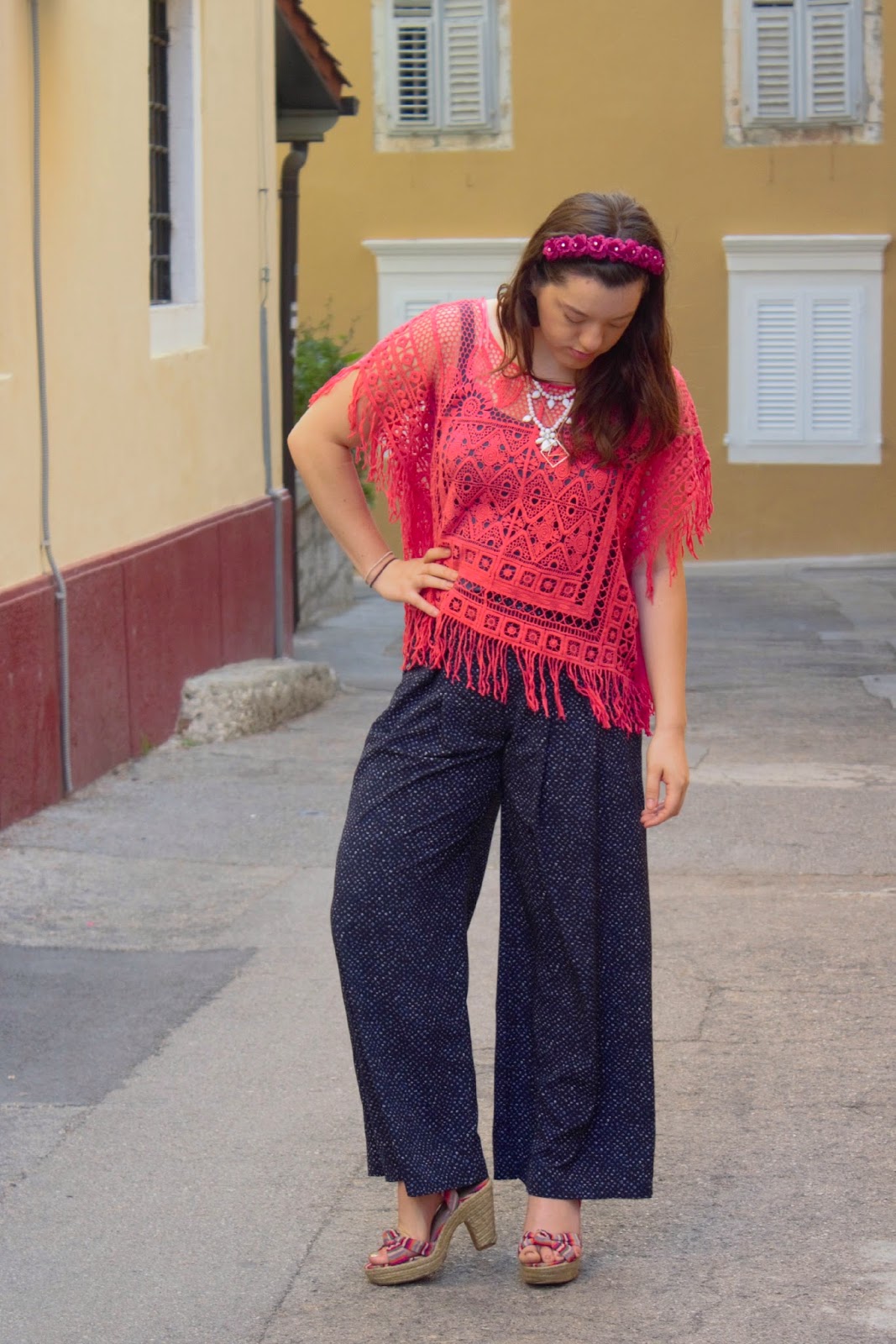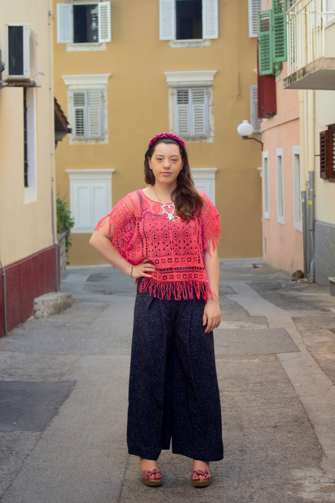 For an evening look, I layered the crochet top over a vest and trousers combo. I’ve recently discovered trousers for summer, as I normally live in dresses and skirts. I love these wide legged trousers, once I’d turned them up by a couple of inches! However with a pair of heeled sandals I don’t think I look too short, as the high waisted trousers lengthen my legs. I wore a basic vest top underneath the crochet to keep me covered and I was covered enough, yet cool in the warm Summer evening. Throughout my holiday, I kept my fringe held back with a floral headband from Primark. I love my fringe, but if you want a tanned face for summer, it isn’t ideal so although I look a little different, it was a pretty way to fulfil a practical purpose.